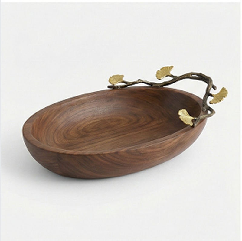 Elevate your dining experience with our artisanal walnut wood serving pieces, adorned with handcrafted brass ginkgo leaf accents.
