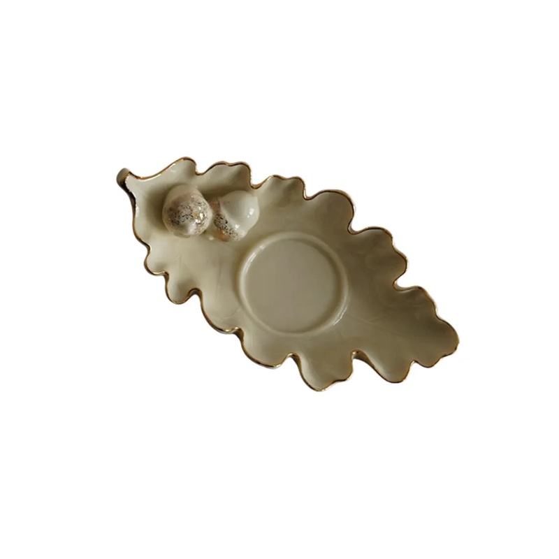 Luxury to your living space with this exquisitely crafted leaf-shaped ceramic tealight holder. Designed with a leaf silhouette, delicate gold-trimmed edges, and charming decorations, it not only holds tealights to warm, but also as a tiny tray for small trinkets.