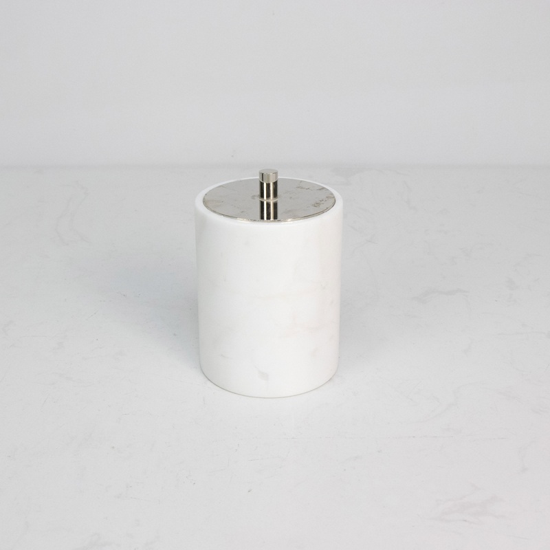 وعاء التوابل الرخامي مصنوع من الرخام الأبيض الطبيعي كارارا والفولاذ المقاوم للصدأ، مما يضيف لمسة فاخرة وأنيقة.