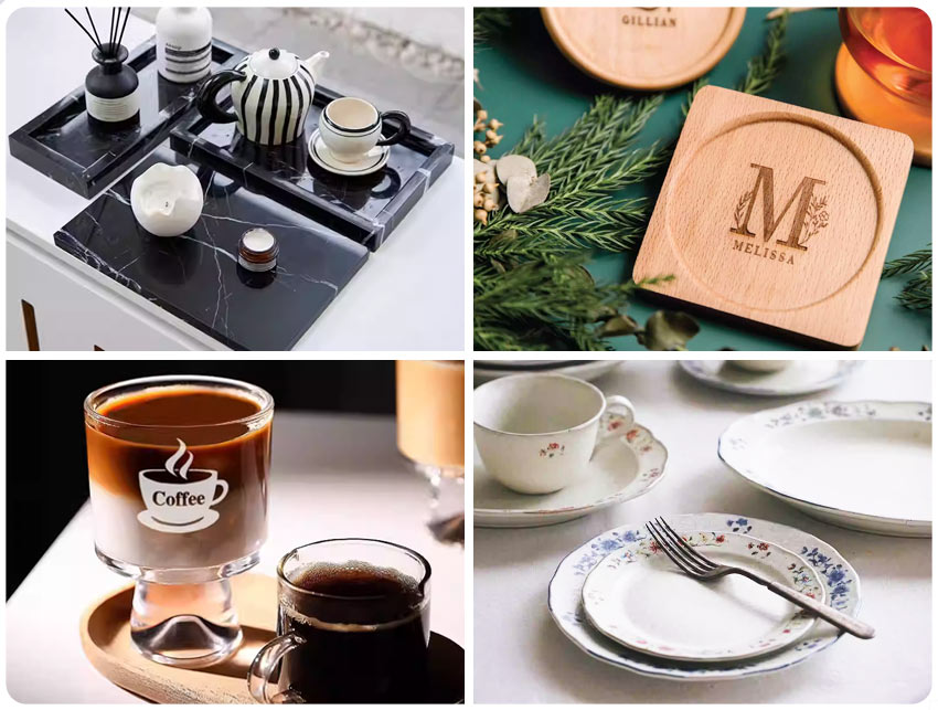 للحصول على مواد متينة ومتينة، نوصي بالطباعة بالليزر لمظهر طبيعي وفاخر. إنها مثالية للمنتجات الخشبية والأواني الزجاجية والأدوات المعدنية.