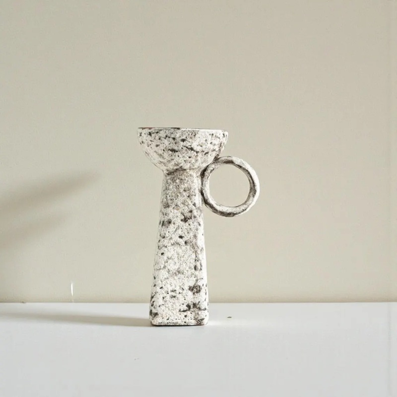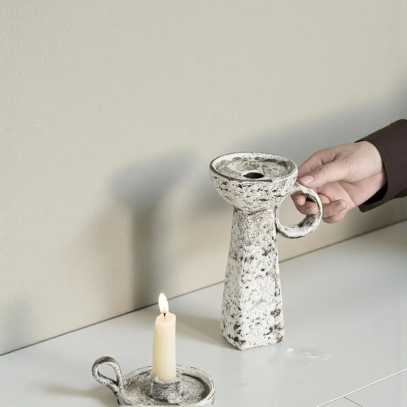 Function: These are more than just candle holders; they are miniature sculptures designed to be captivating focal points. Their earthy, black and white finish and distinctive handles make them a perfect addition to any Japandi, rustic, or minimalist interior.