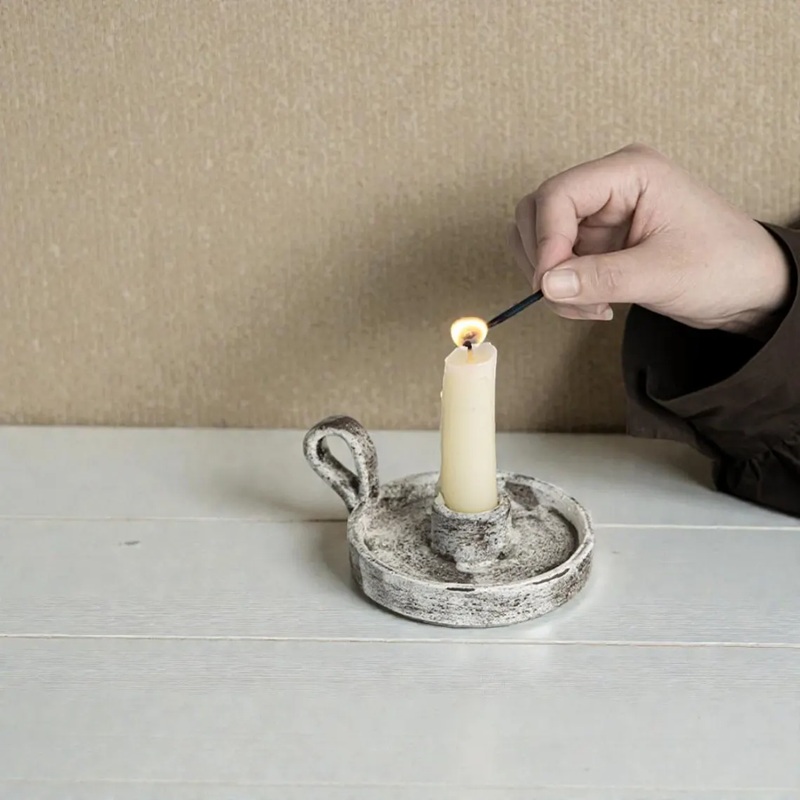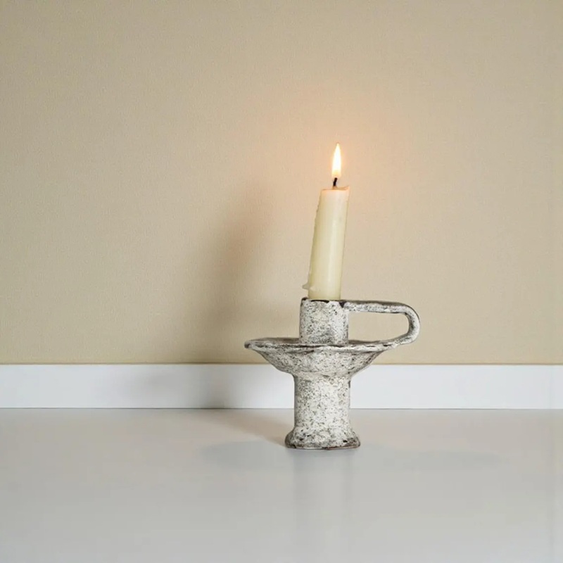 This vintage distressed ceramic candle holder blends rustic texture with practical design